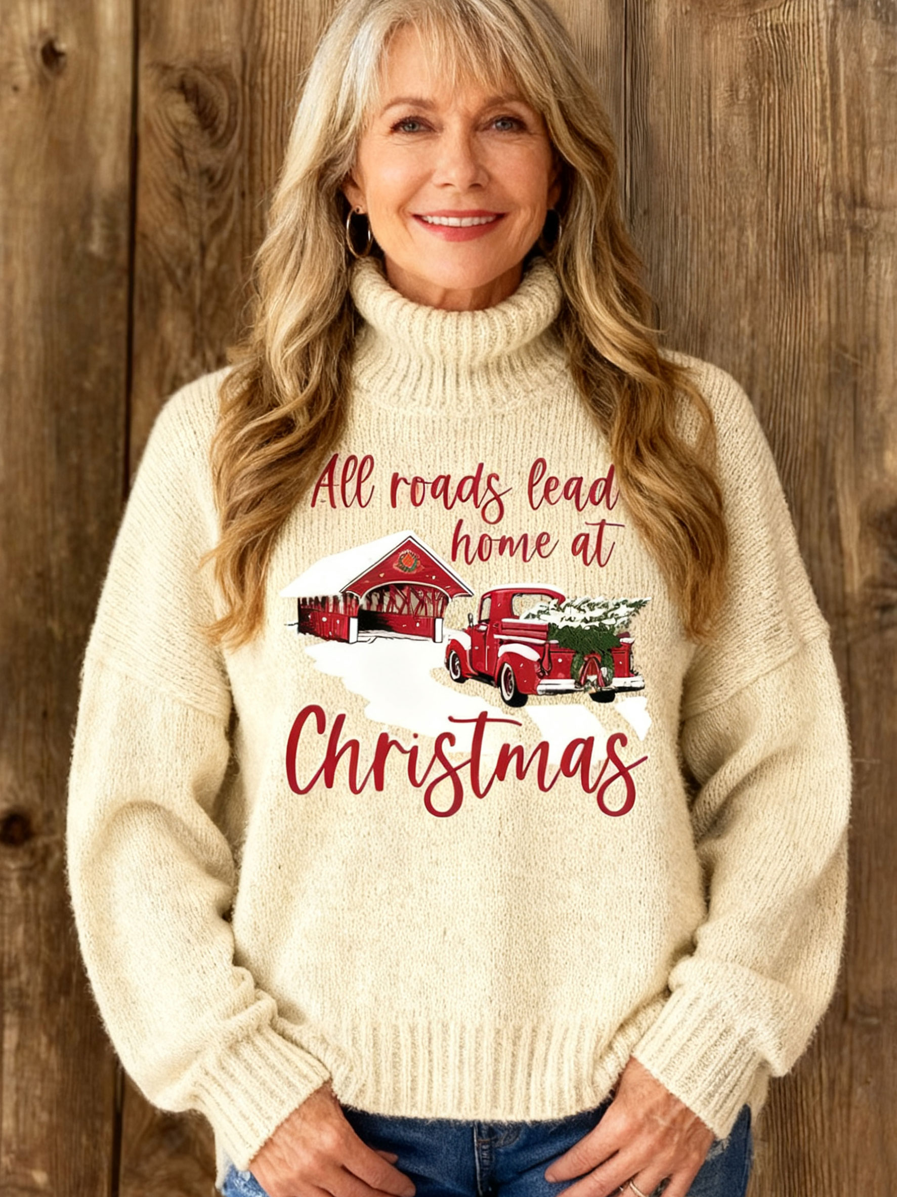 Vintage Christmas Print Knit Turtleneck Pullover Sweater