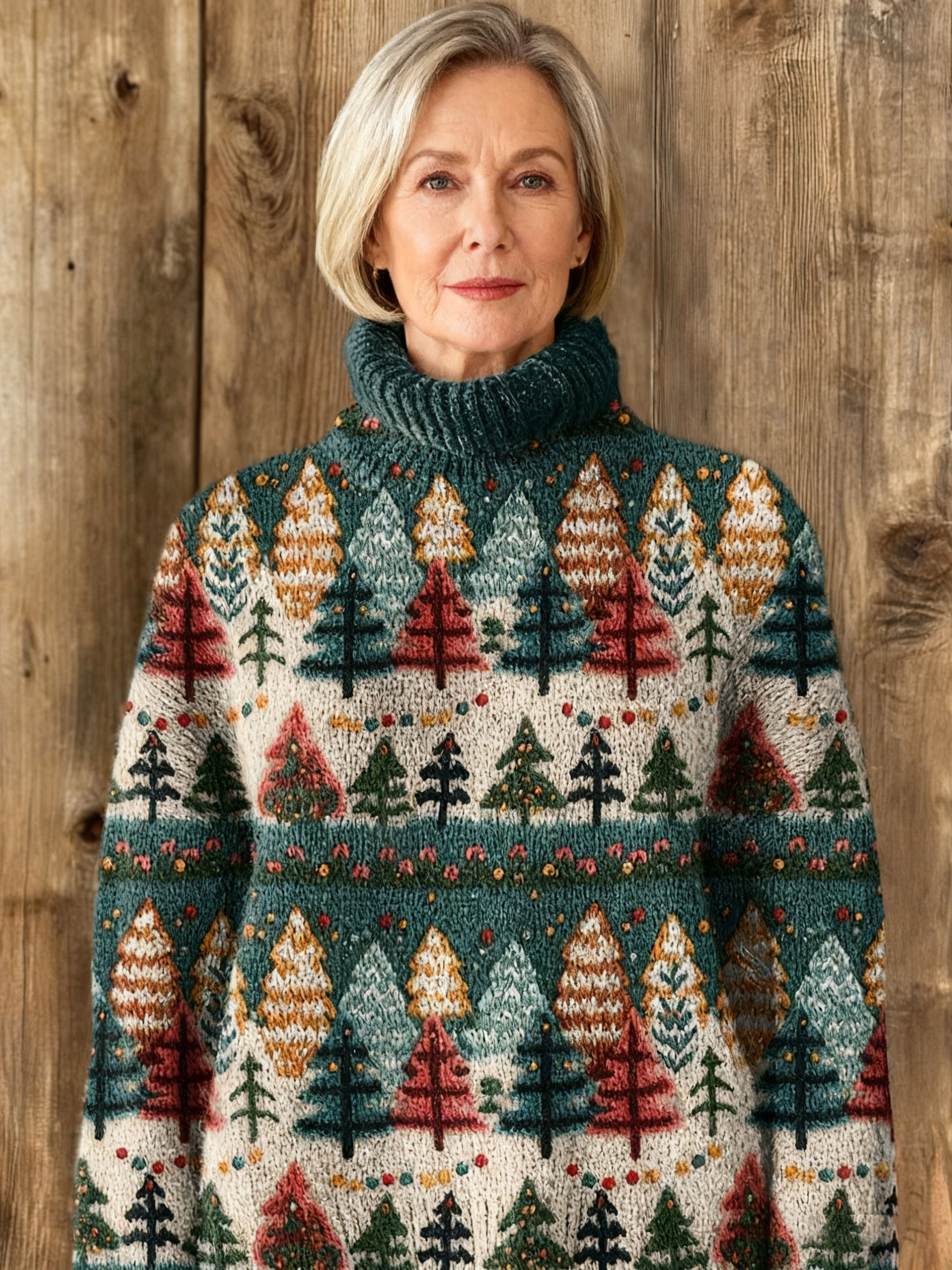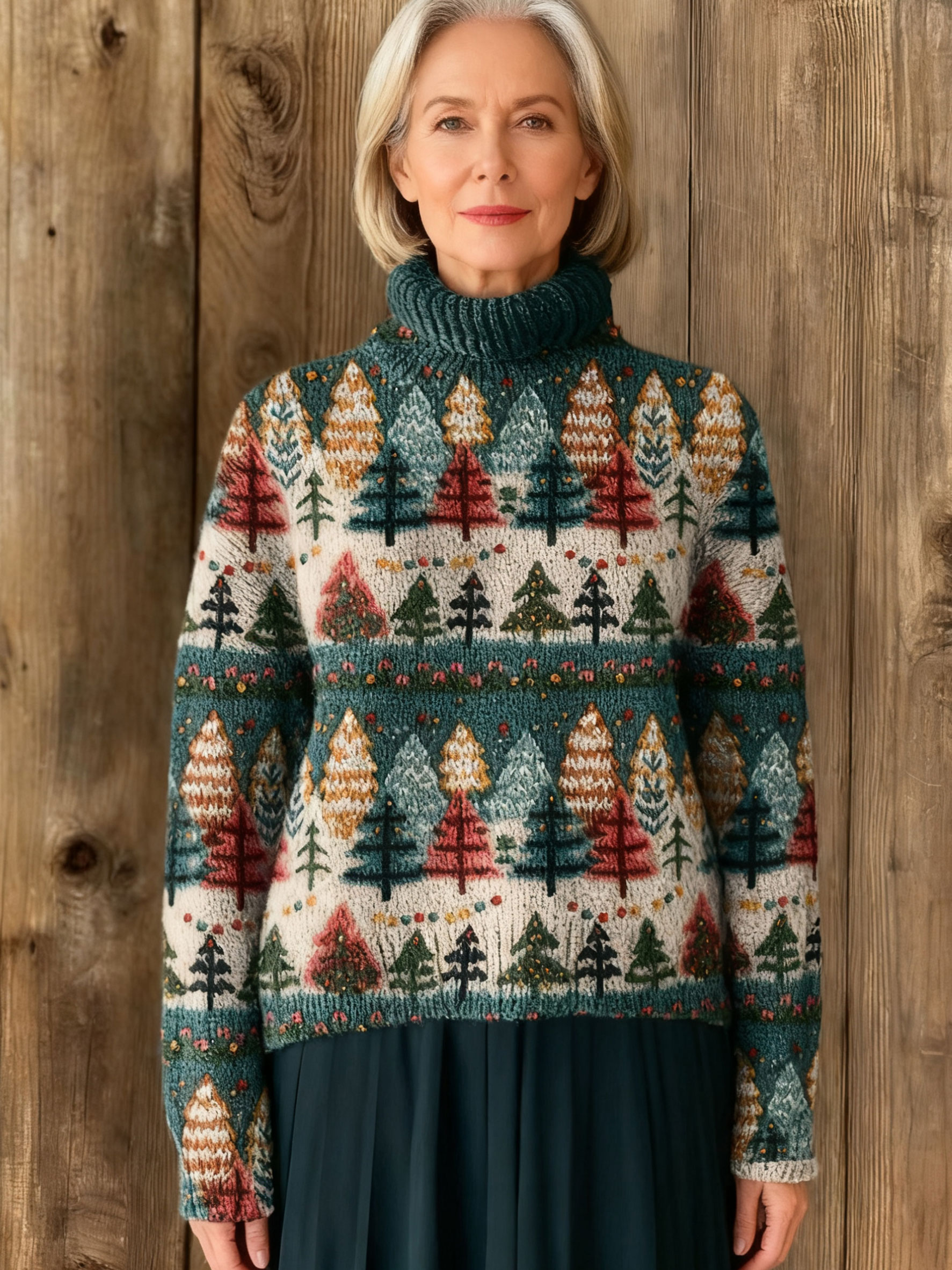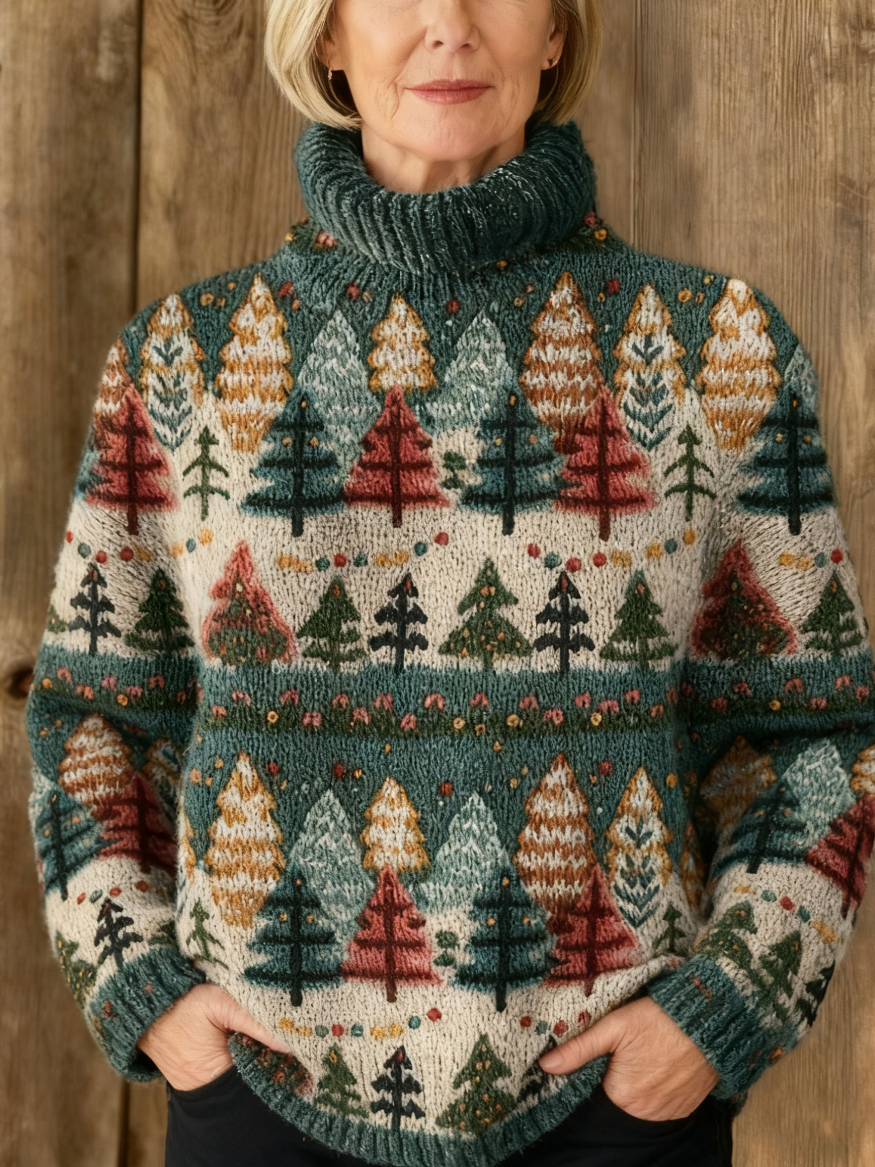 Vintage Christmas Print Knit Turtleneck Pullover Sweater