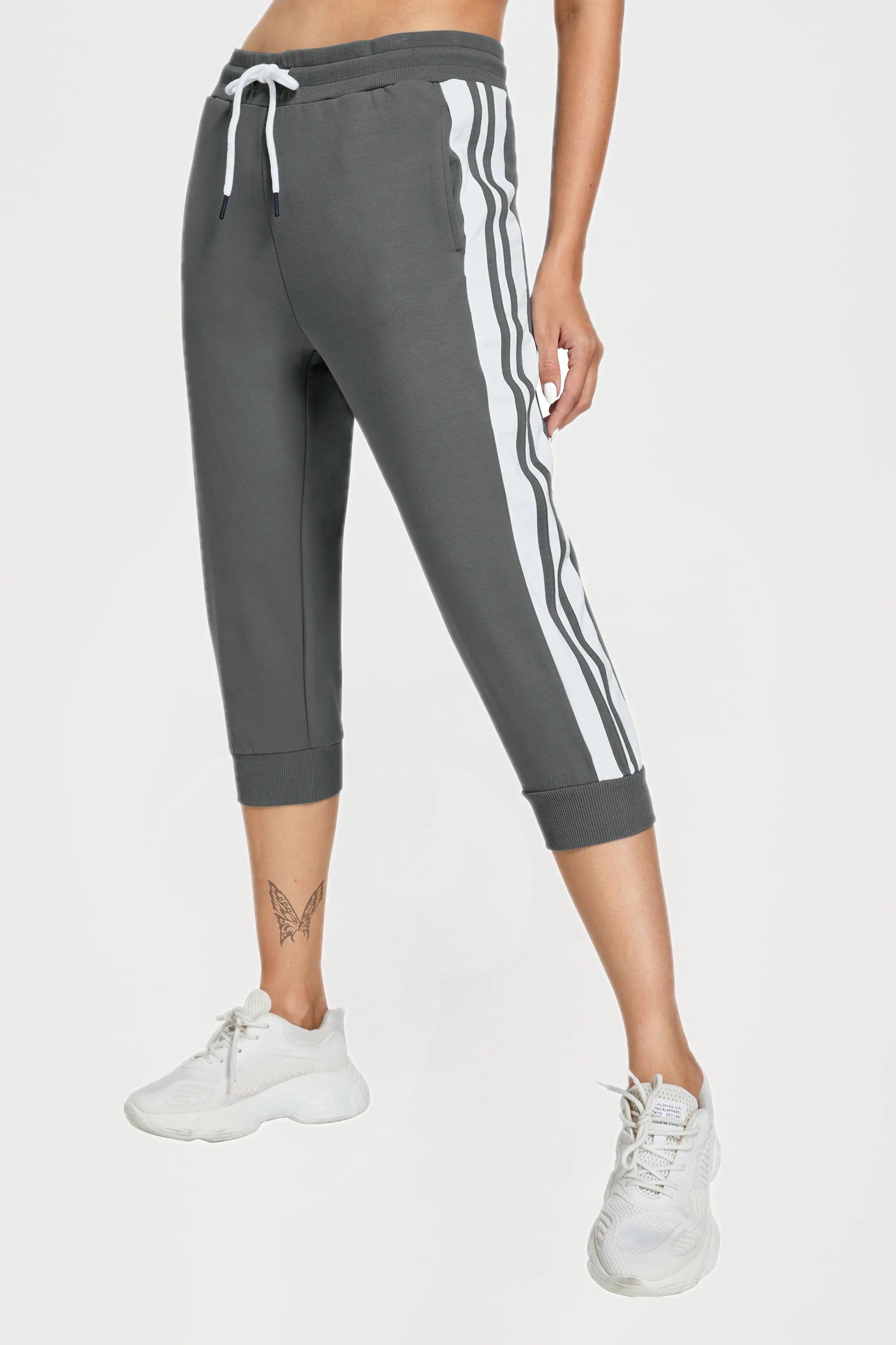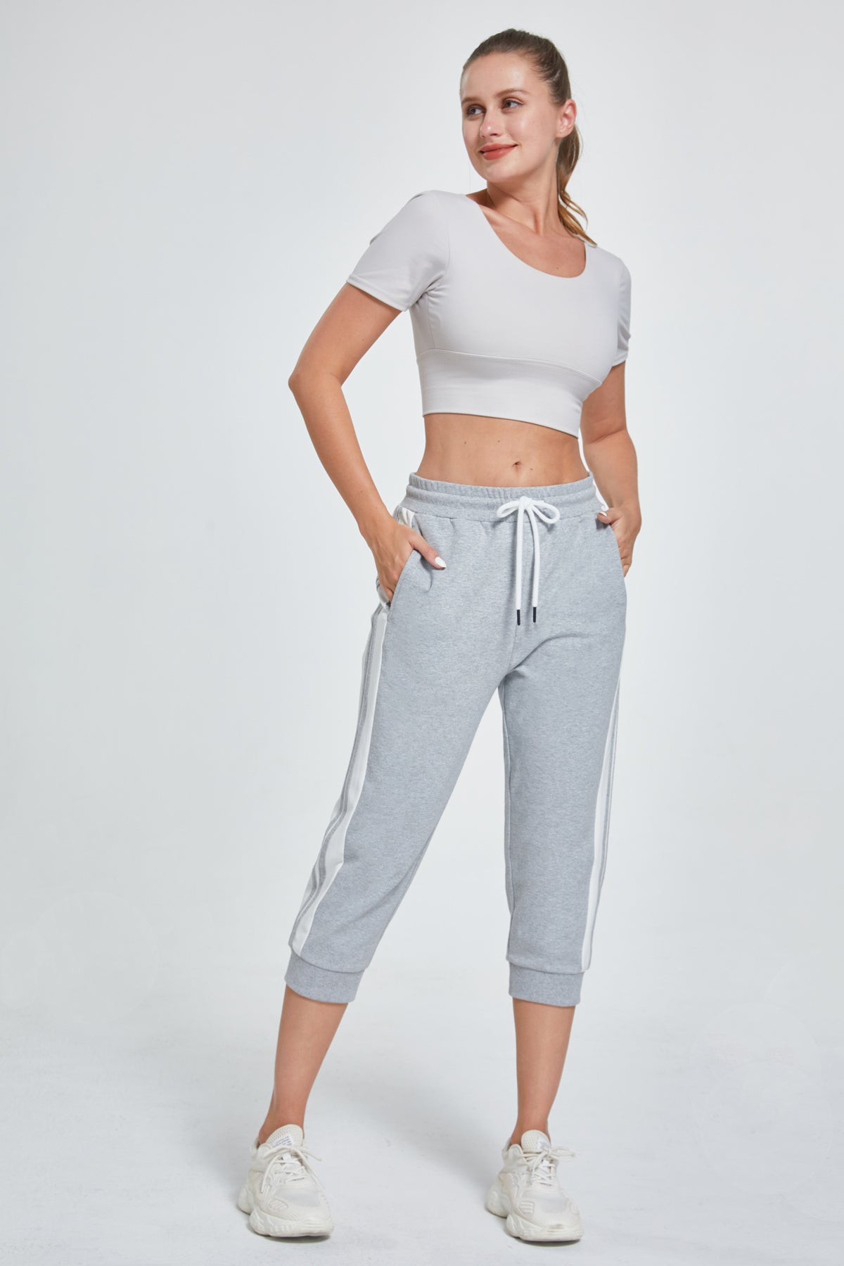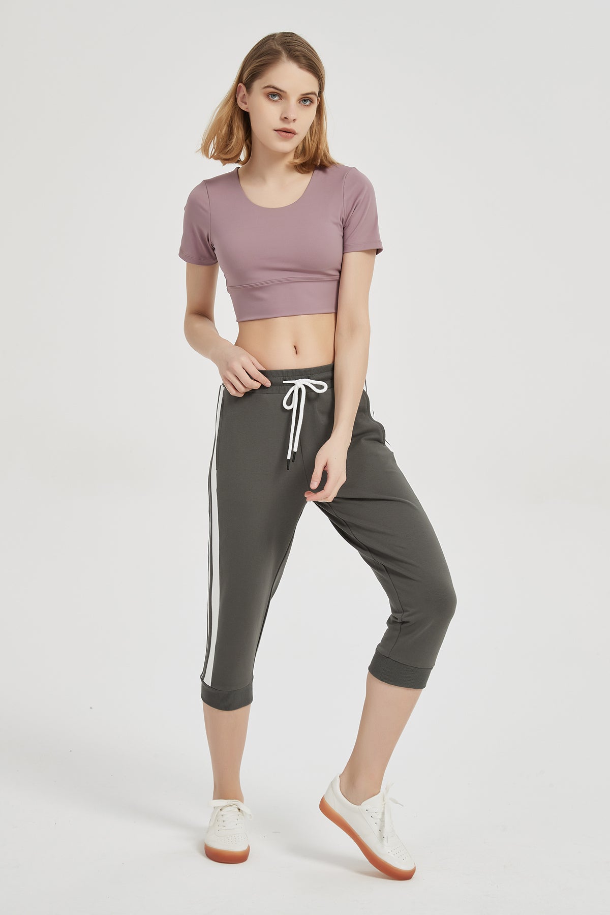 These Mid-rise women's cotton capris feature an elasticated rib waistband with contrast color white lace drawstring closure, made of 96% cotton & 5% spandex, suitable?for outdoor activities such as fitness,cycling,travel, hiking, climbing, runnning, workout and casual daily wear?
