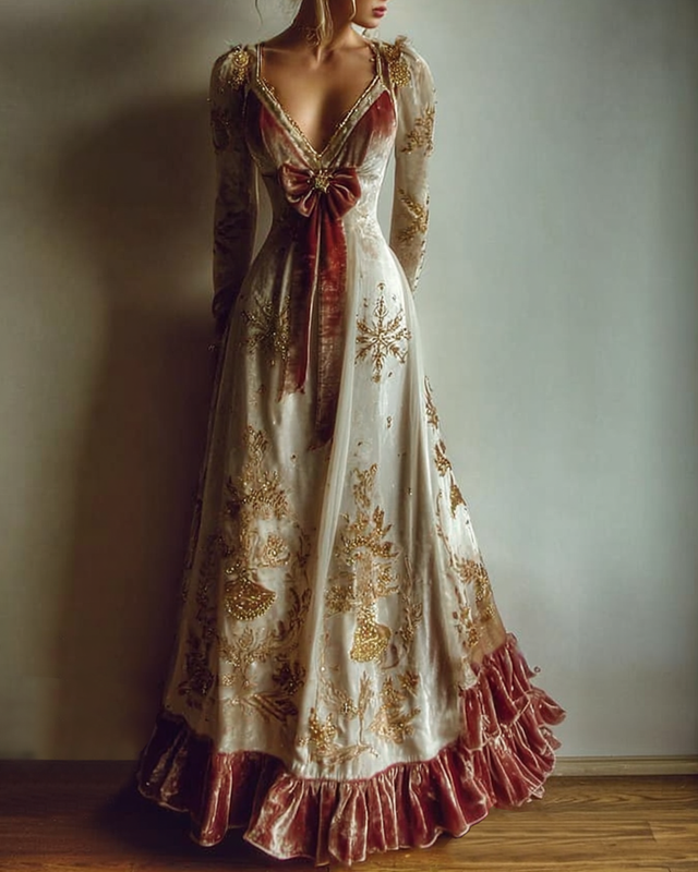 Christmas-Themed Gradient Snowflake Beaded Embroidered Bow Velvet Dress 5637