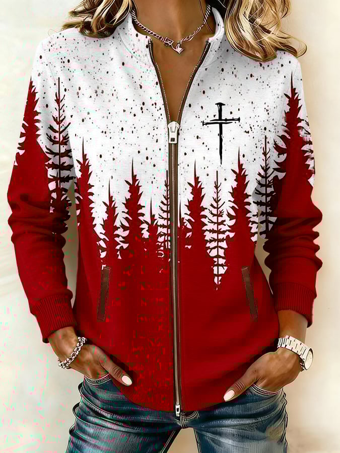 Women's Christmas Faith Print Stand Collar Zip Cardigan