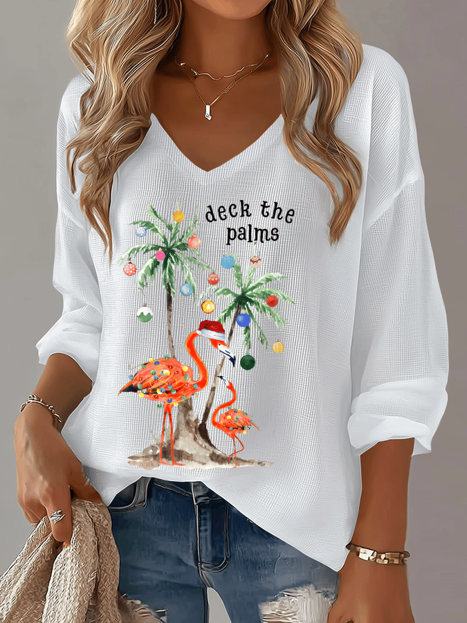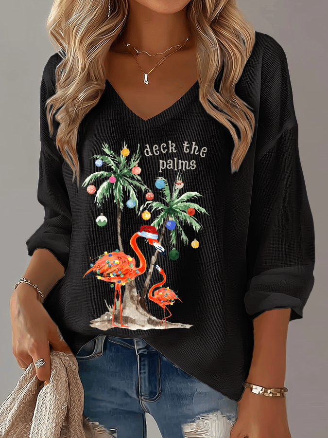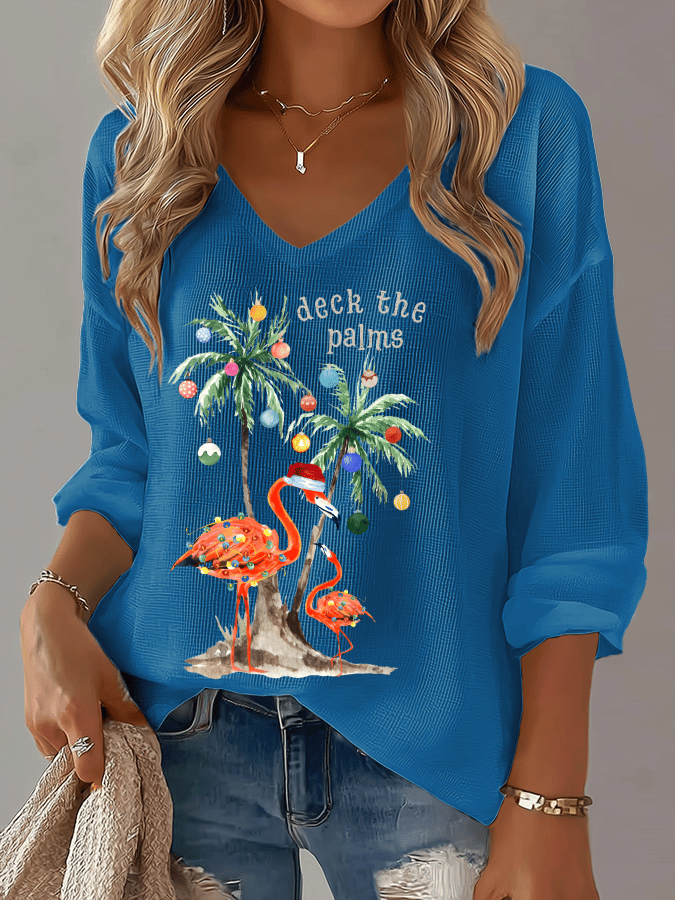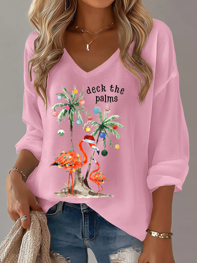 Women's Christmas Tree Print Waffle Long Sleeve T-Shirt