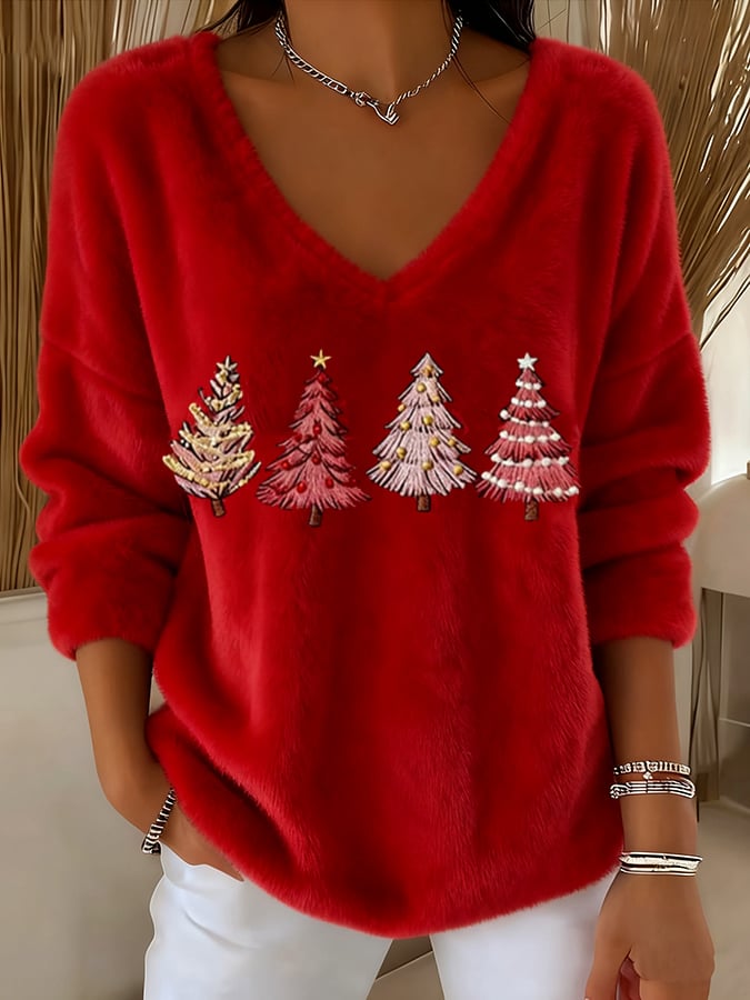 Women's Flannel Christmas Art Print V-Neck Top