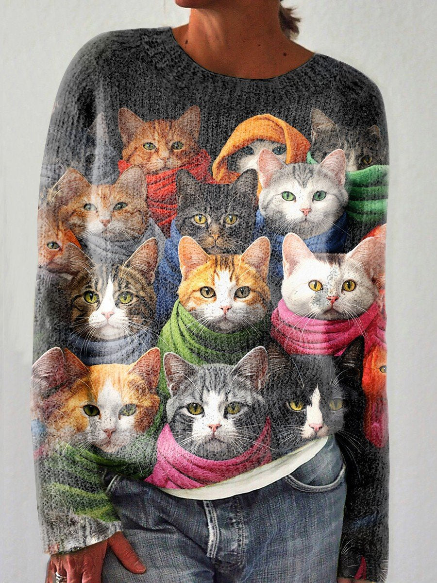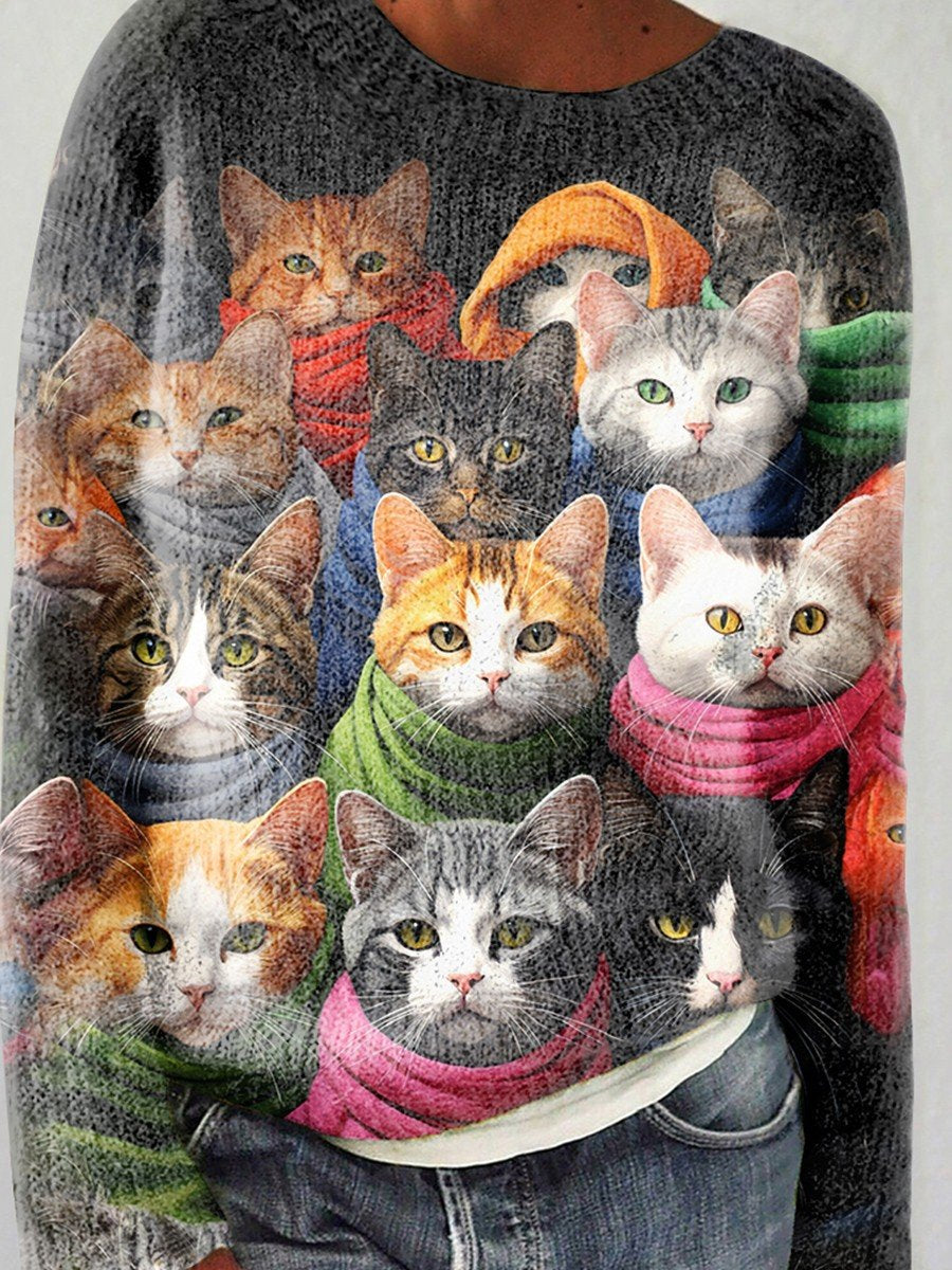 Women's Funny Cat Printed Casual Pullover Knitted Sweater
