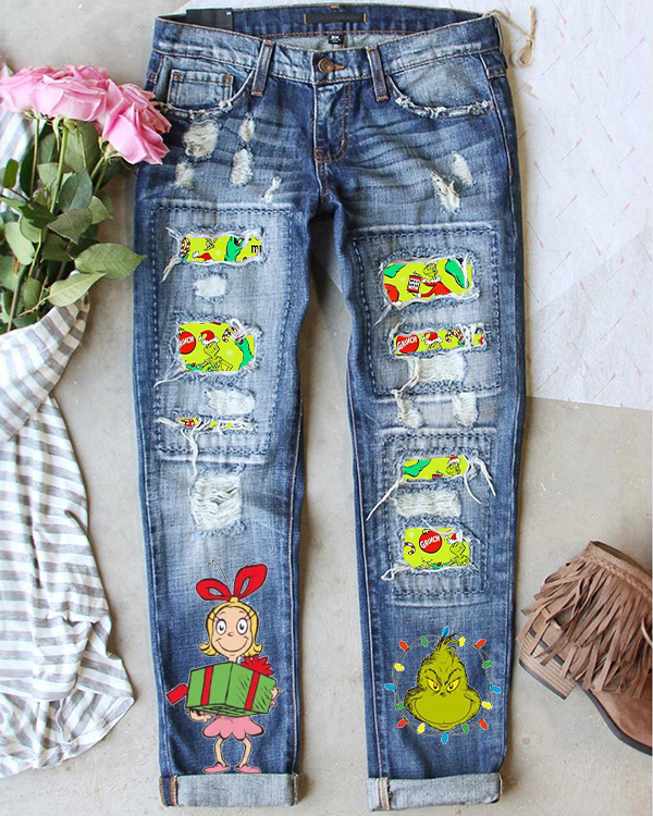 Women's Merry Christmas Print Loose Jeans