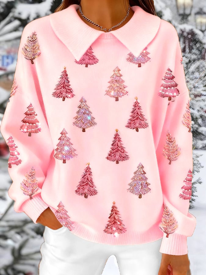 Women's Pink Christmas Tree Collar Knit Top
