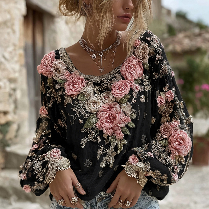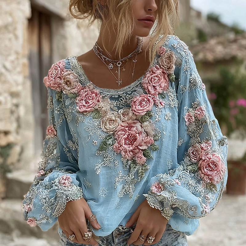 Women's Pink Rose Embroidery Art Round Neck Long Sleeve Linen Blend T-shirt