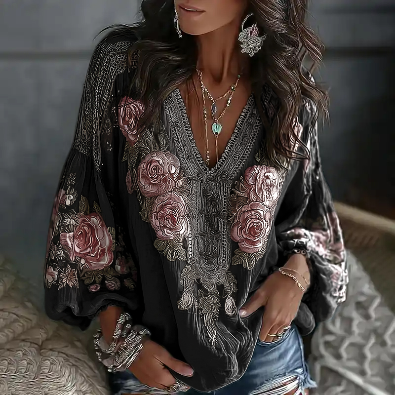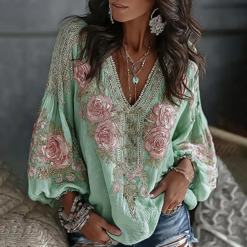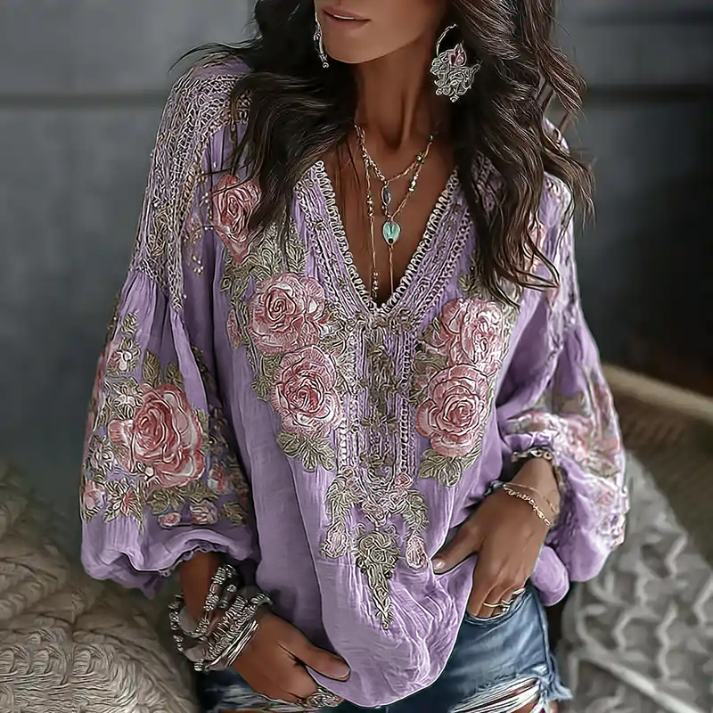 Women's Retro Floral Embroidered Art Print Flowy Linen Blend Casual Tops