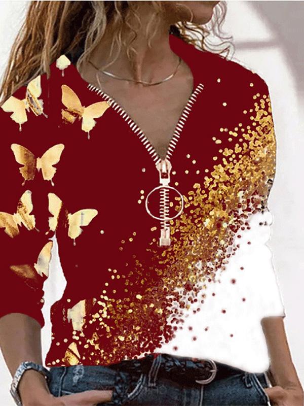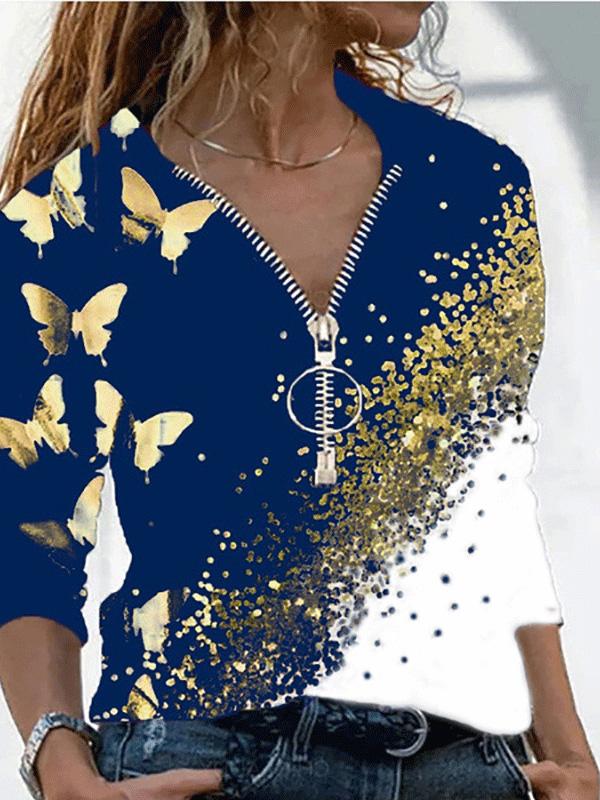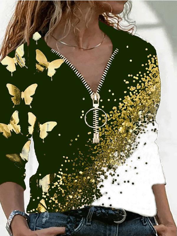 - Feature:?V-Neck, Zipper, Butterfly Print, Long Sleeve