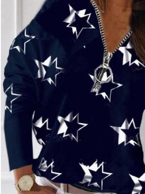 ?V-Neck, Zipper, Star Print, Long Sleeve