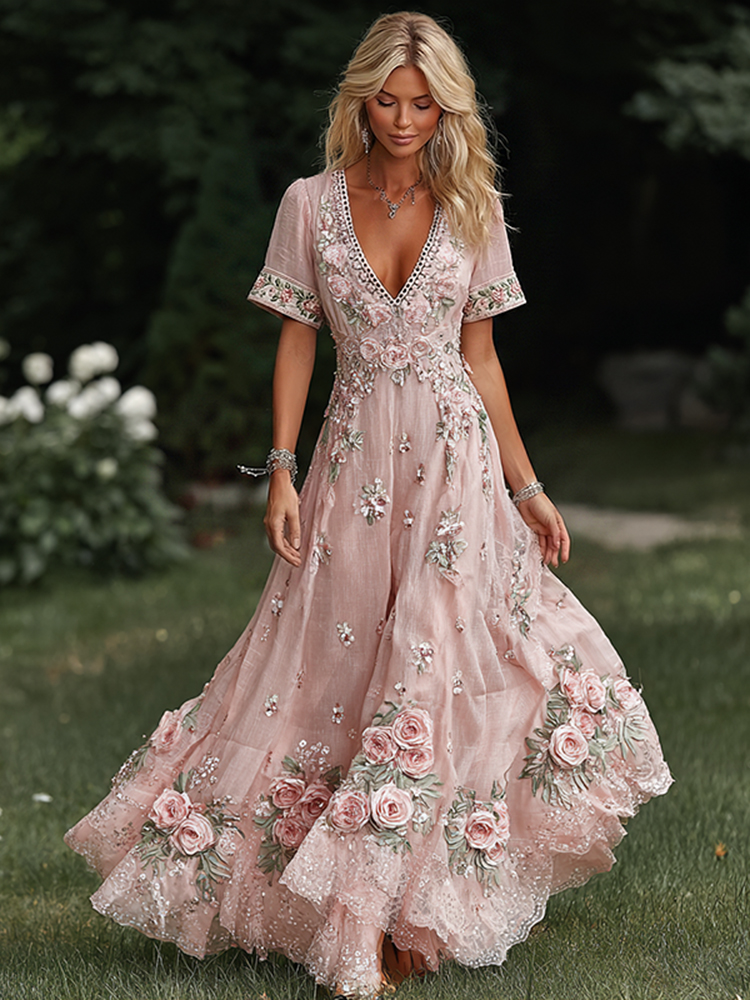 Women's Vacation Rose With Floral Print Short Sleeve Dress