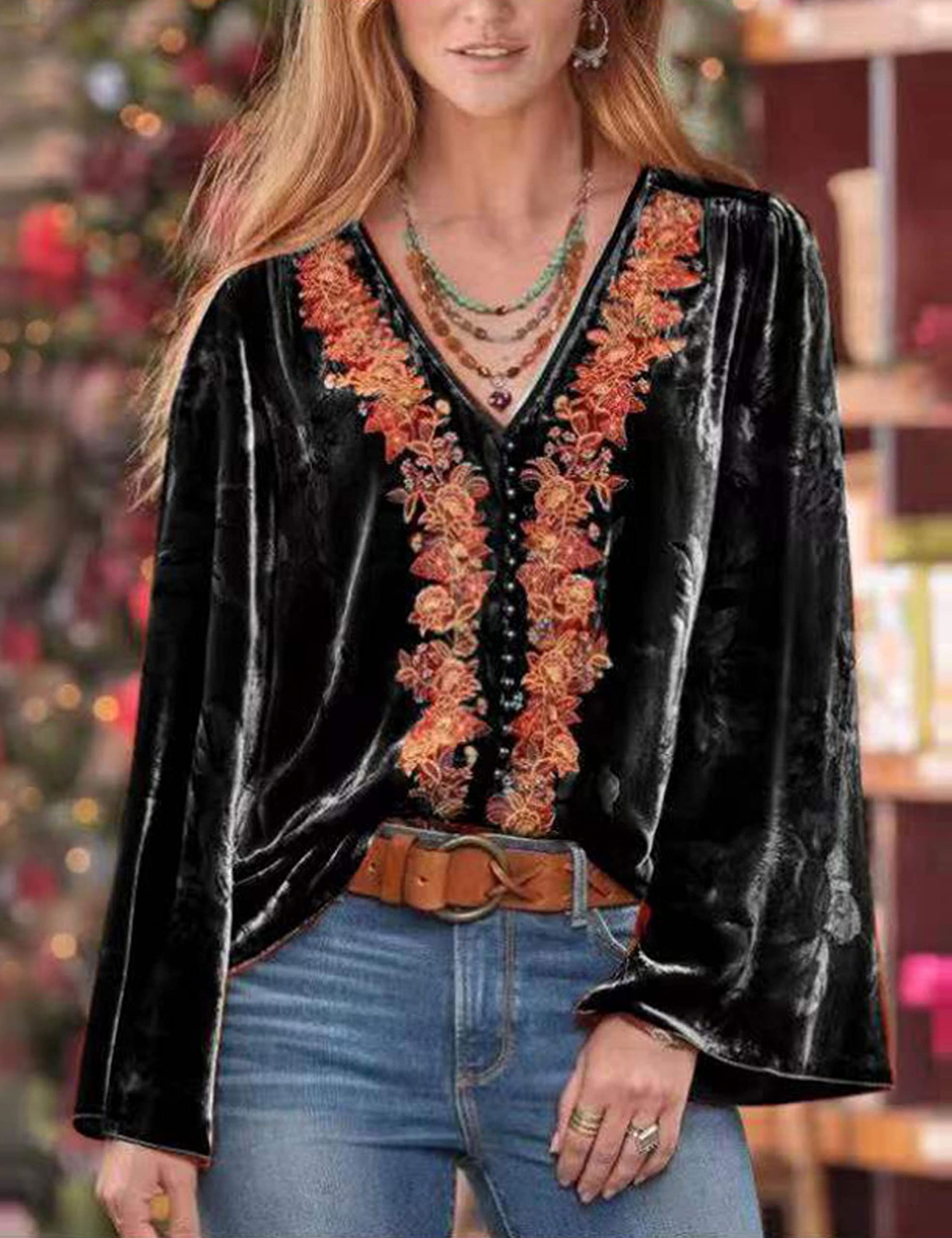 Product Name:Women's Velvet Shirt Floral Print V-Neck Ladies Blouse Top