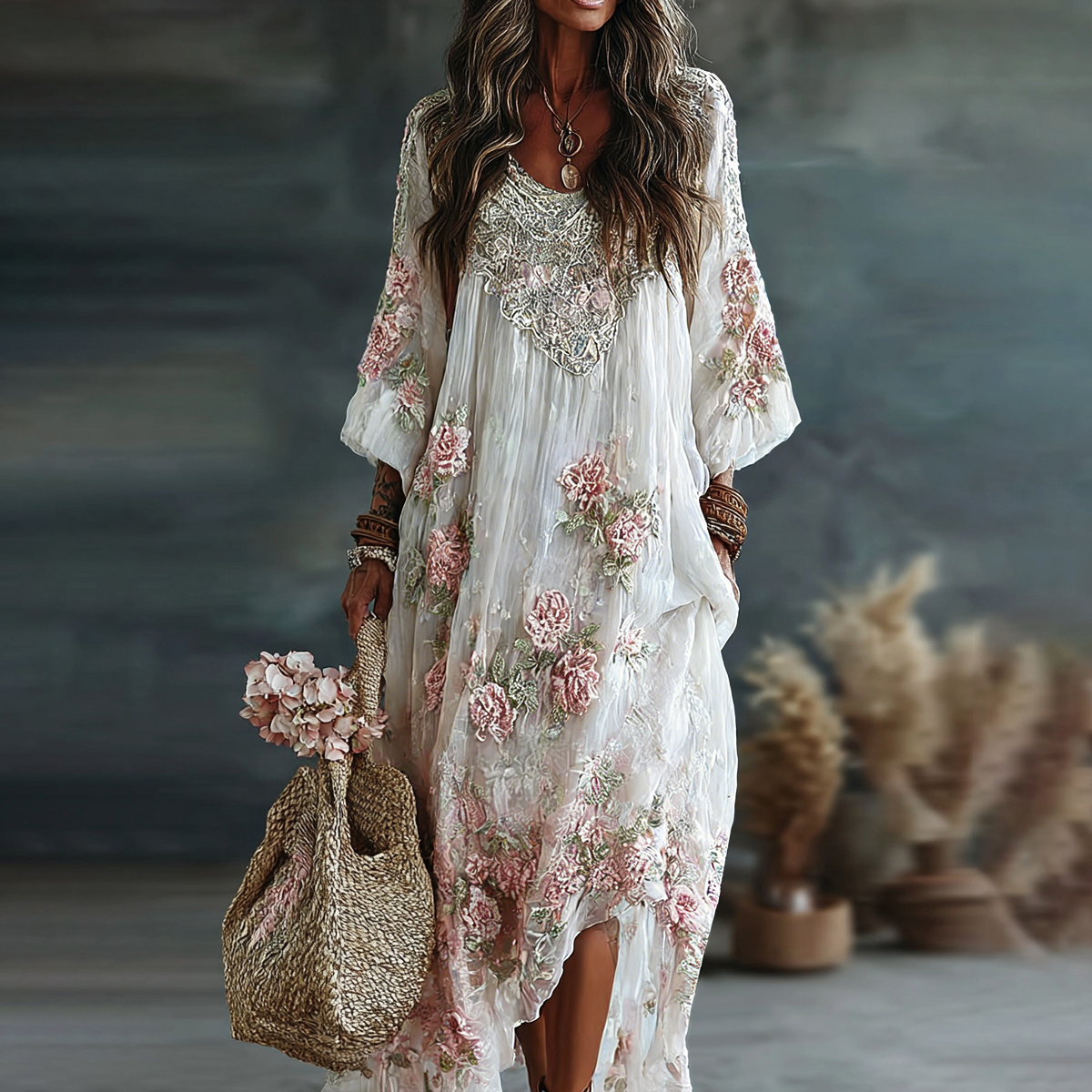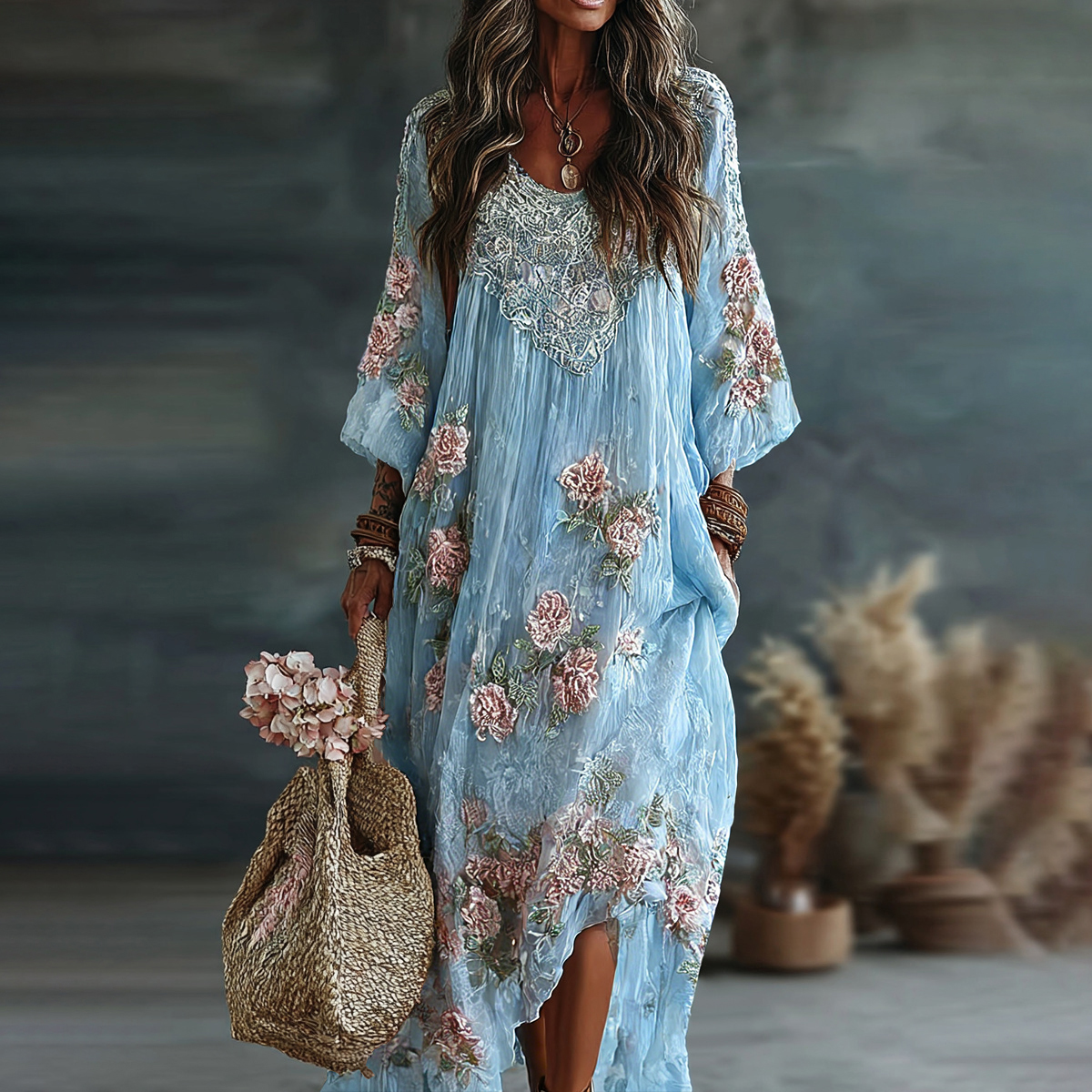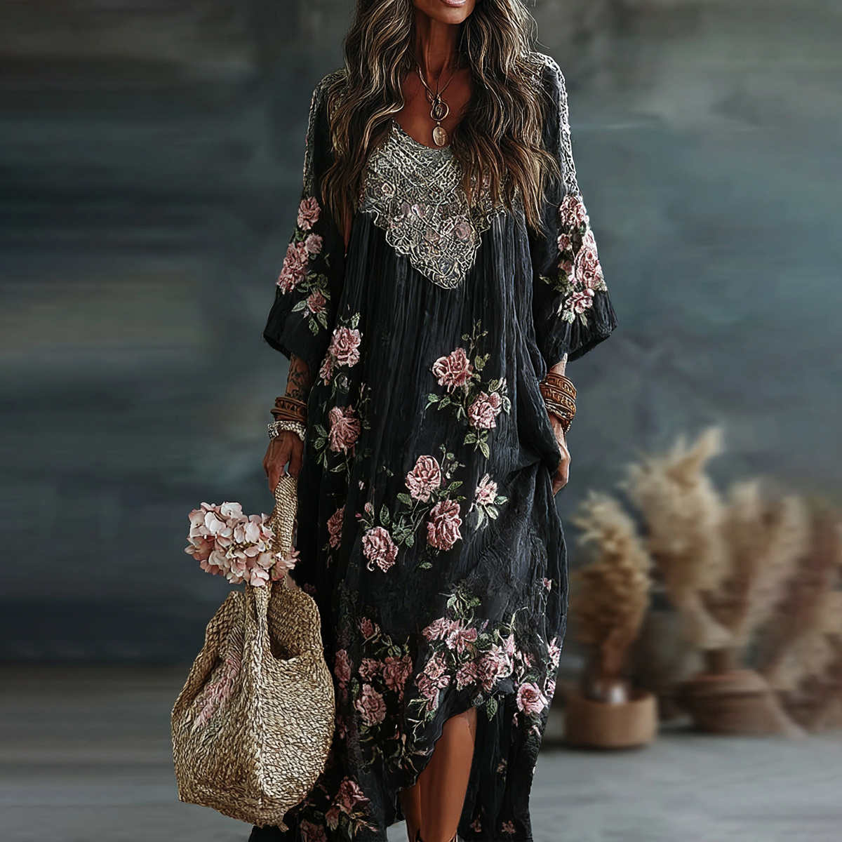 Women's Vintage Floral Art Flowy Linen Blend Casual Long Sleeve Maxi Dress