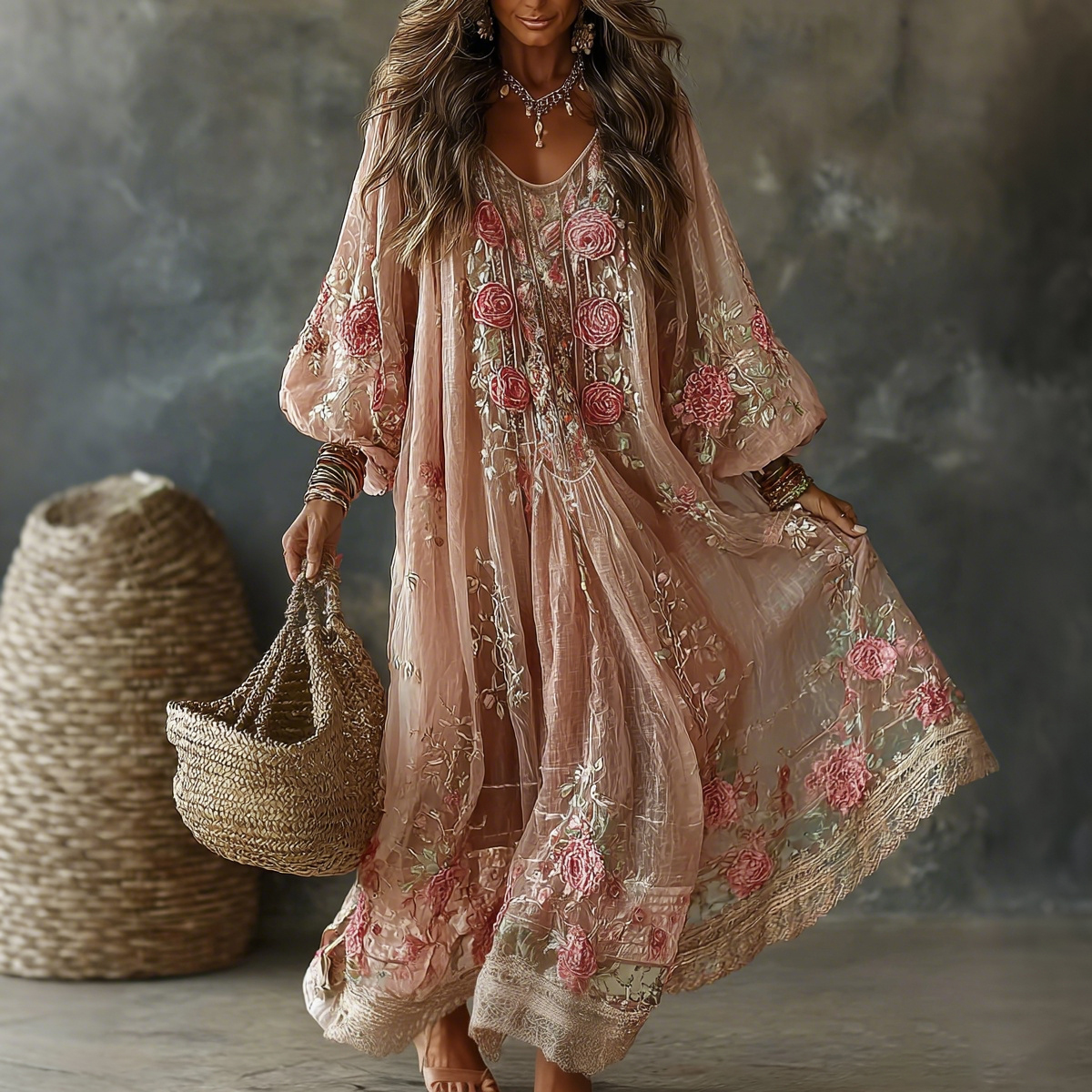 Women's Vintage Floral Art Print Flowy Linen Blend Casual Long Sleeve Maxi Dress