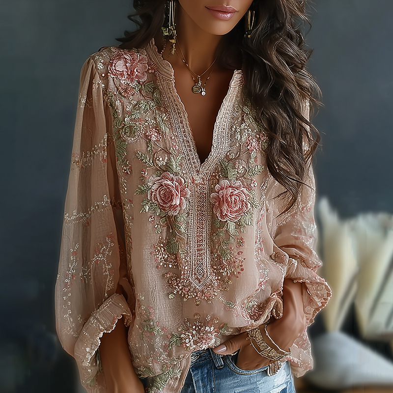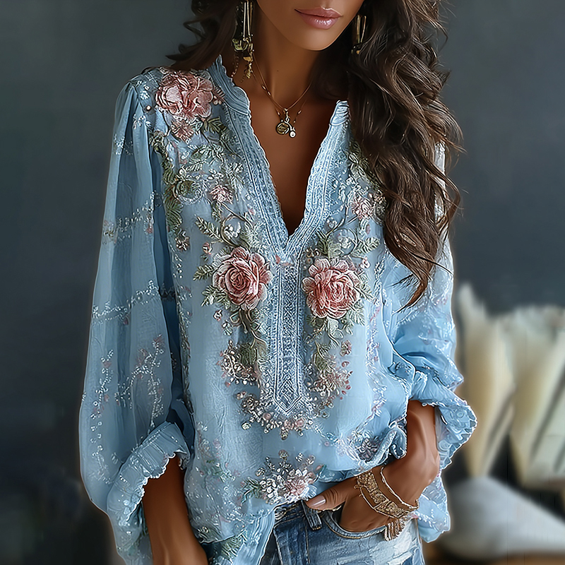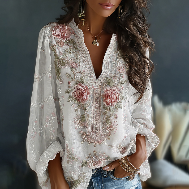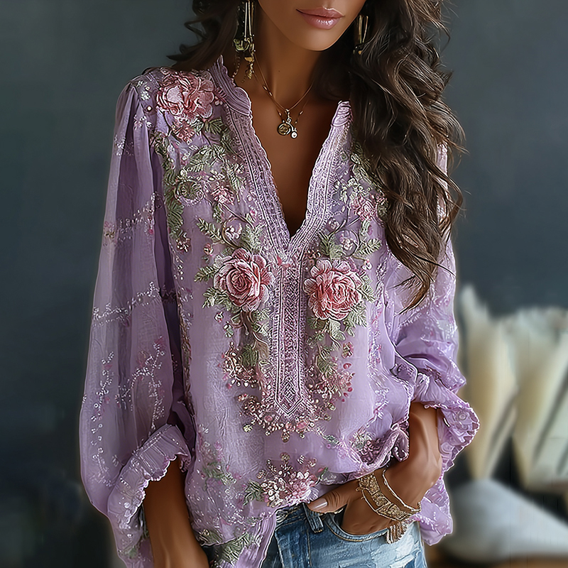 Women's Vintage Spring Floral Embroidered Art Print Flowy Linen Blend Casual Tops